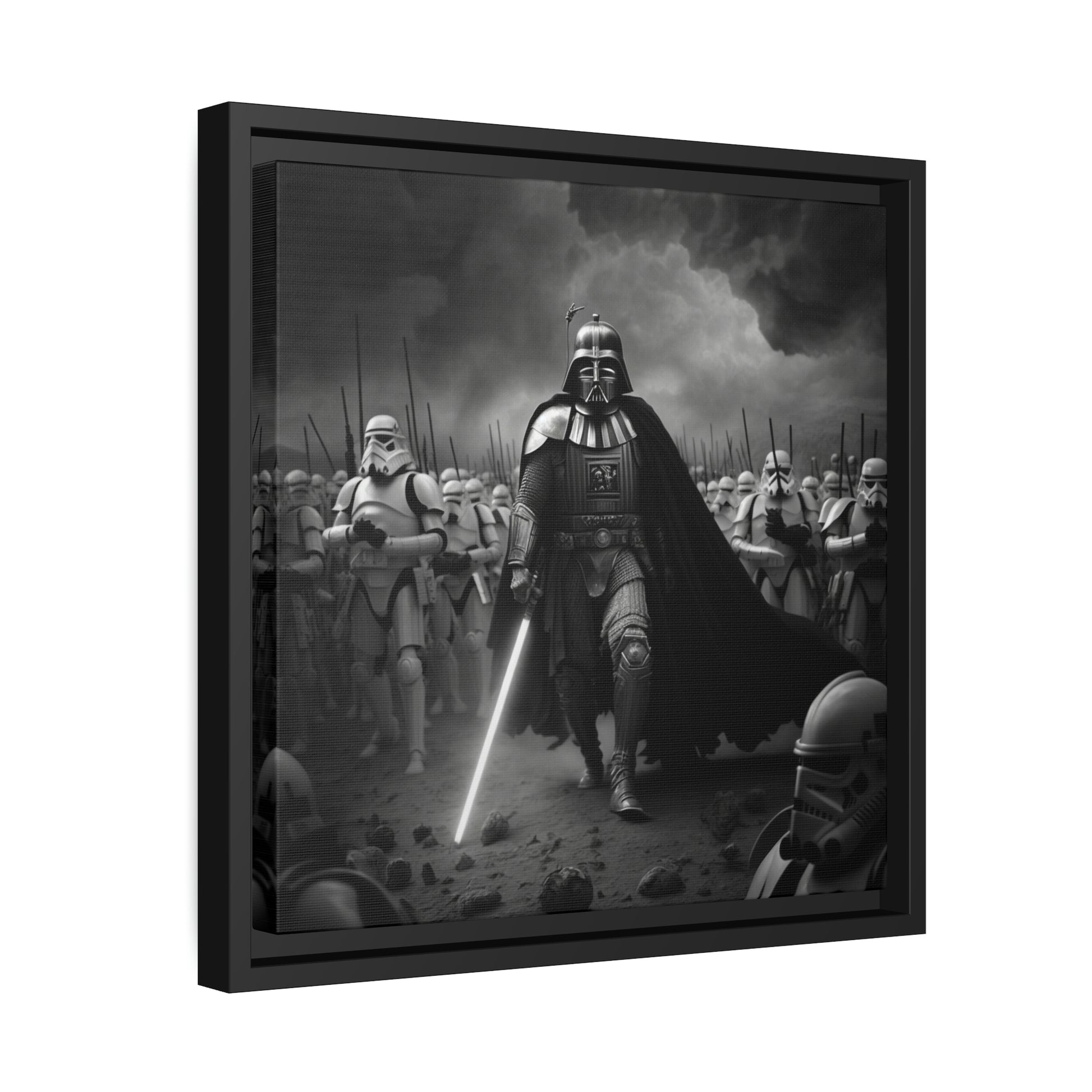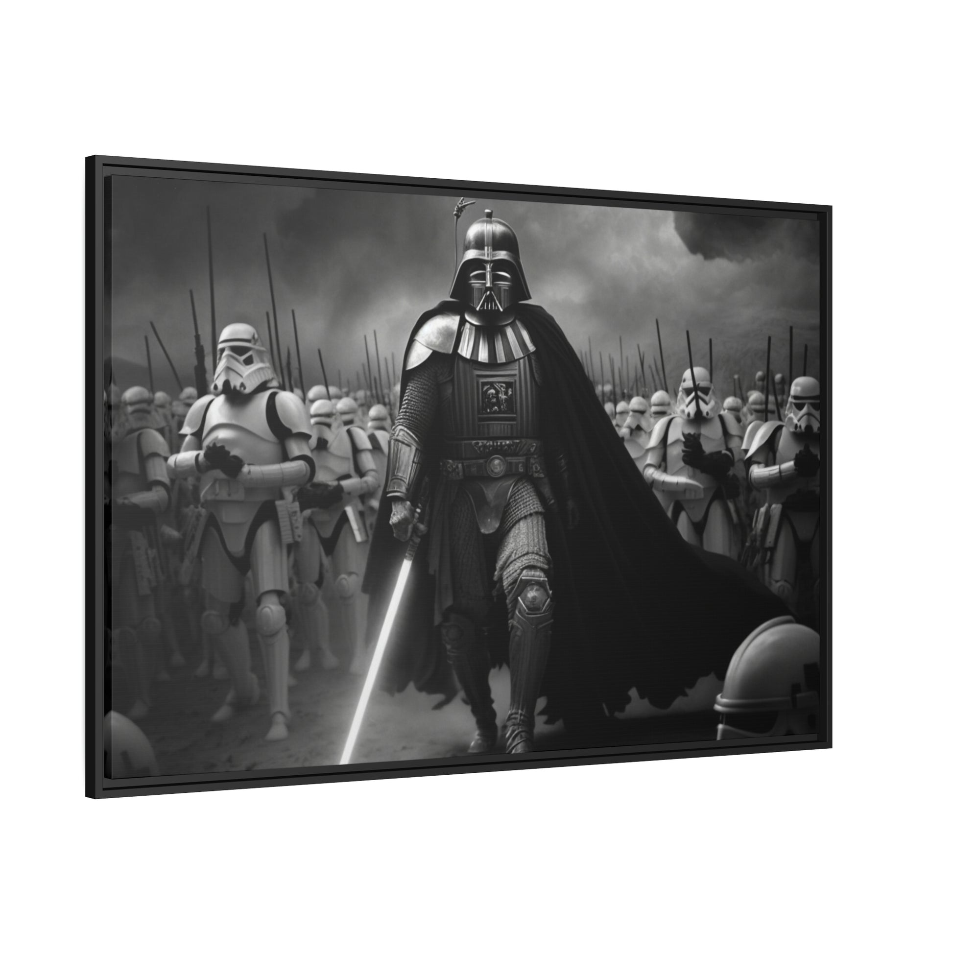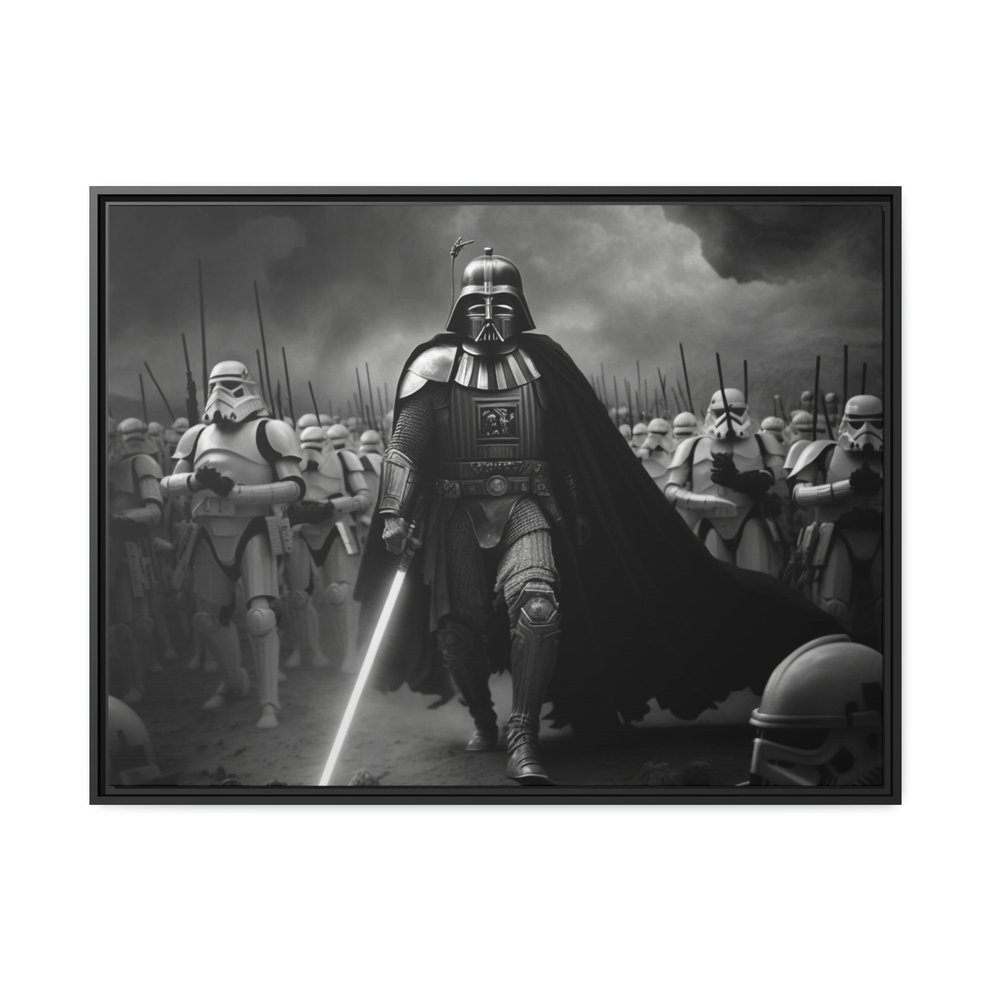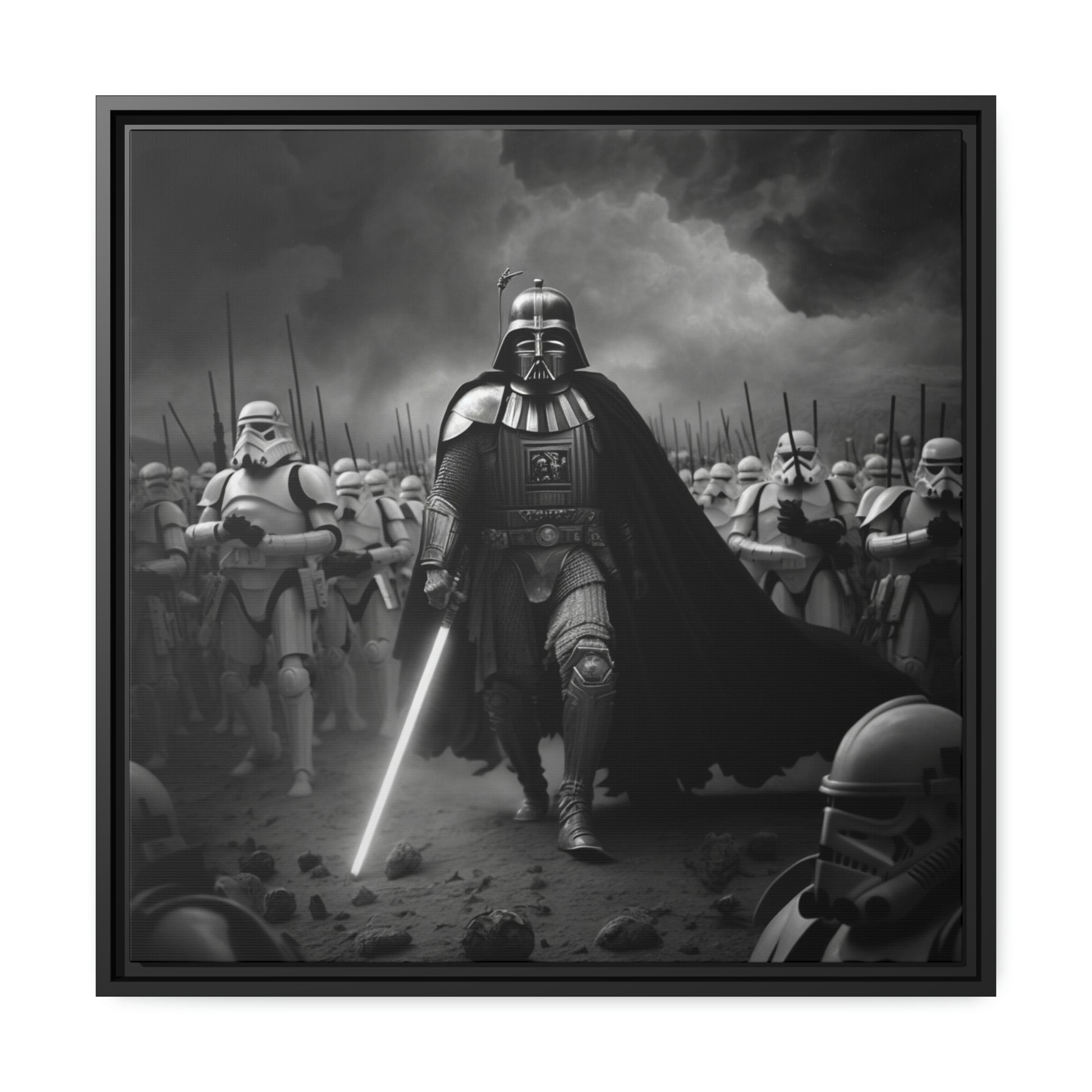 This unique piece captures the drama and intensity of the battle in a visually striking and captivating way, with the added touch of Star Wars imagery. The black and white photo of Lord Vader Leadings his stormtroopers to battle adds a historical touch to the piece, while the vintage style adds warmth and character to your home decor, making it perfect as a statement piece. Whether you're a fan of history or Star Wars