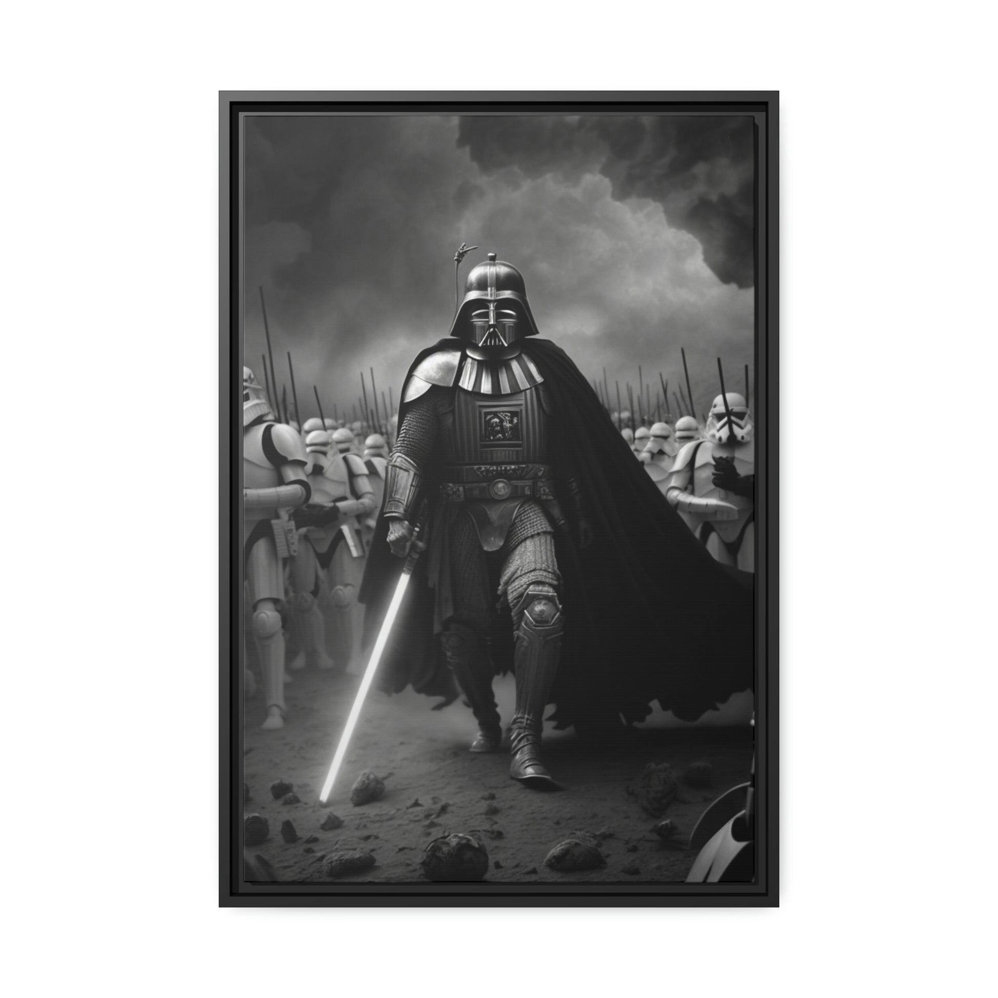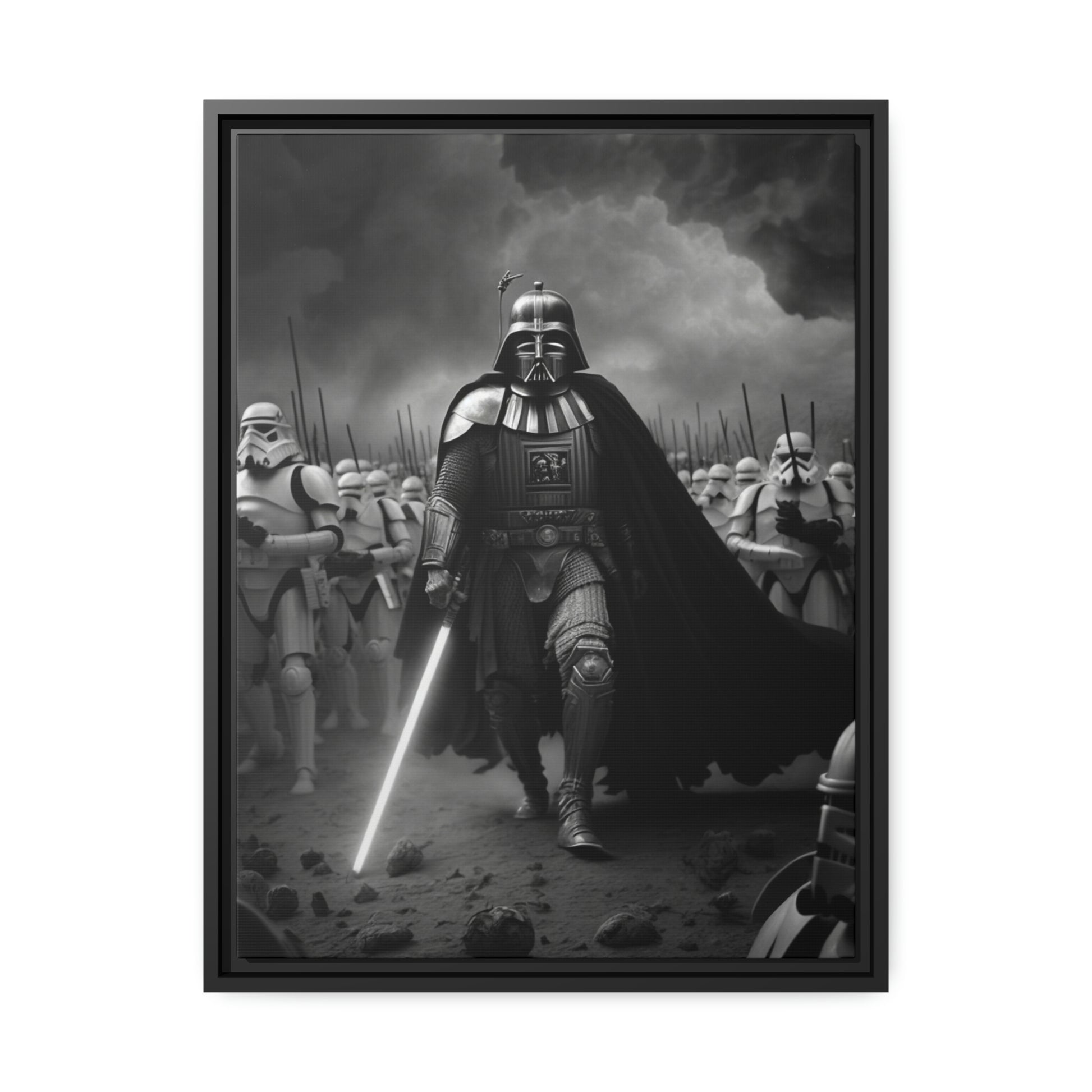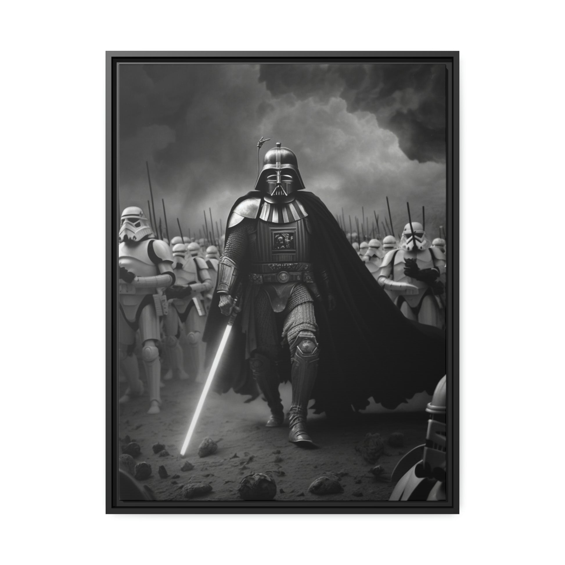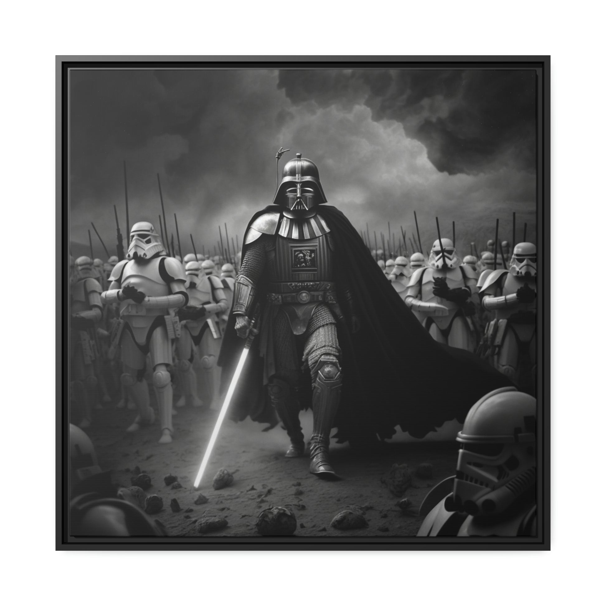 This unique piece captures the drama and intensity of the battle in a visually striking and captivating way, with the added touch of Star Wars imagery. The black and white photo of Lord Vader Leadings his stormtroopers to battle adds a historical touch to the piece, while the vintage style adds warmth and character to your home decor, making it perfect as a statement piece. Whether you're a fan of history or Star Wars