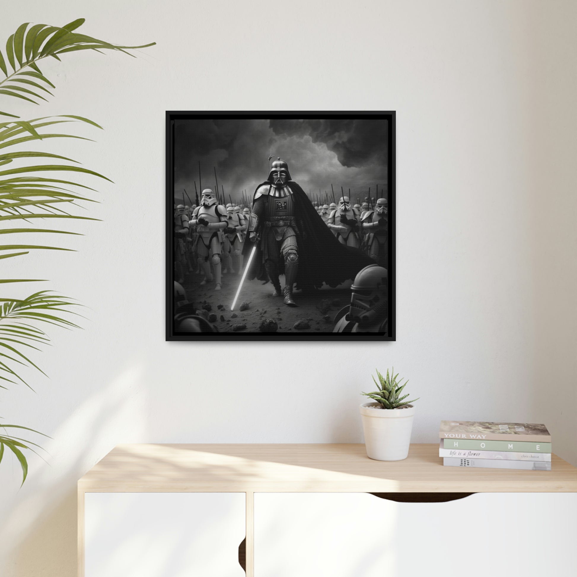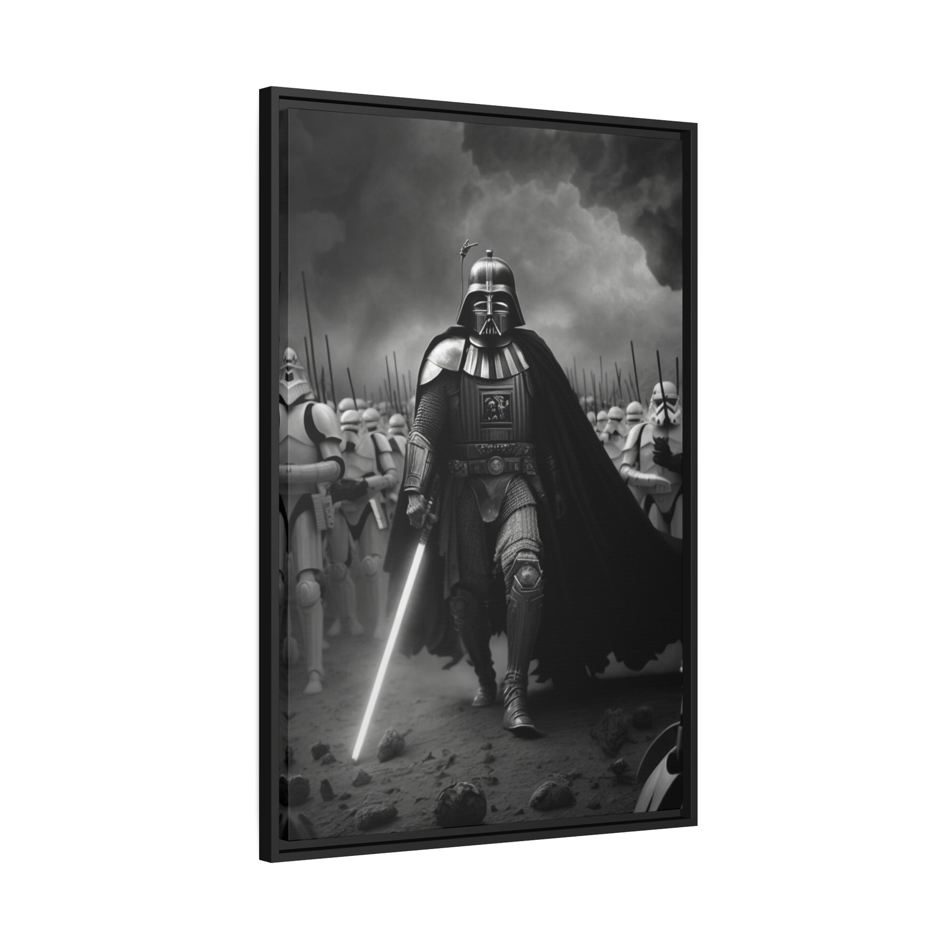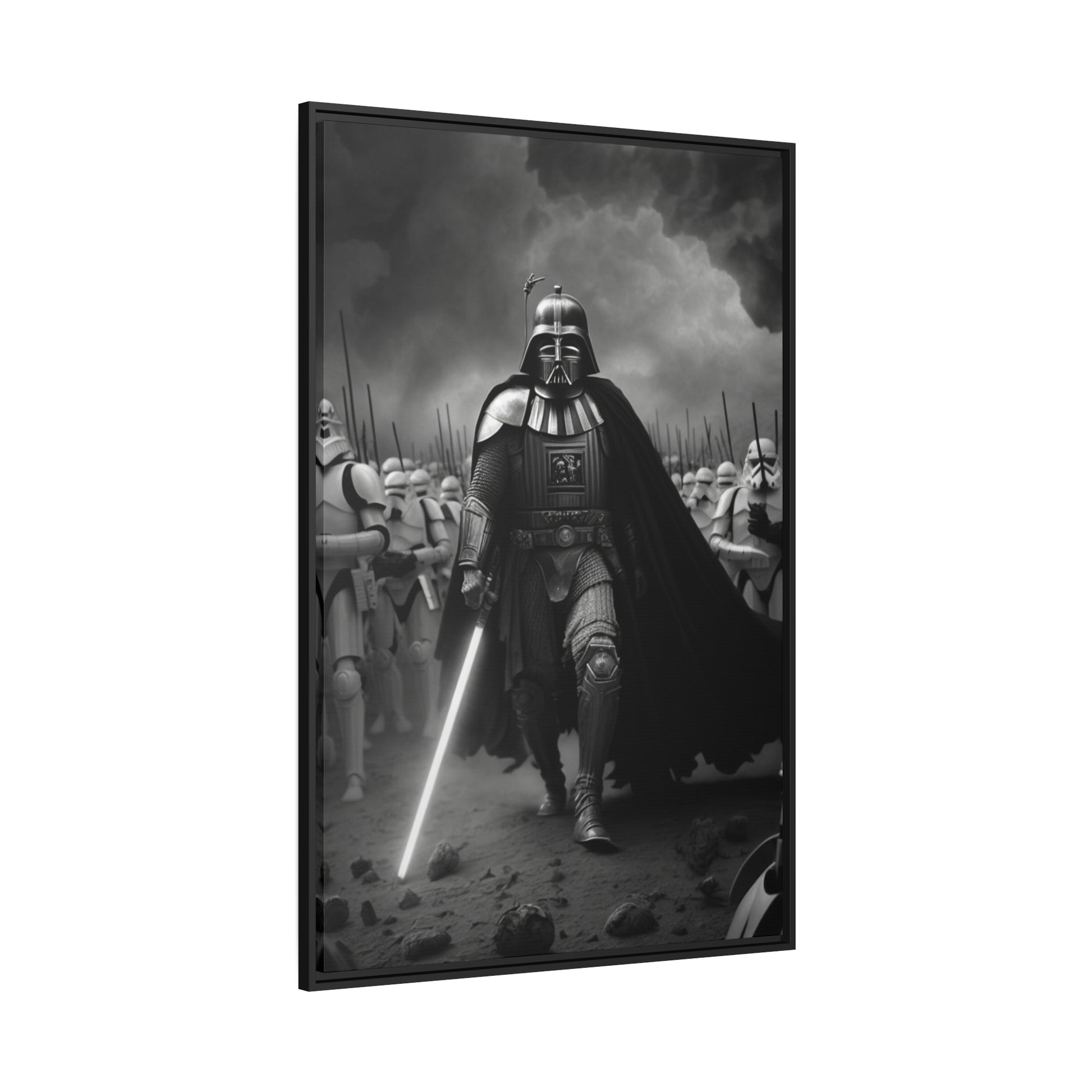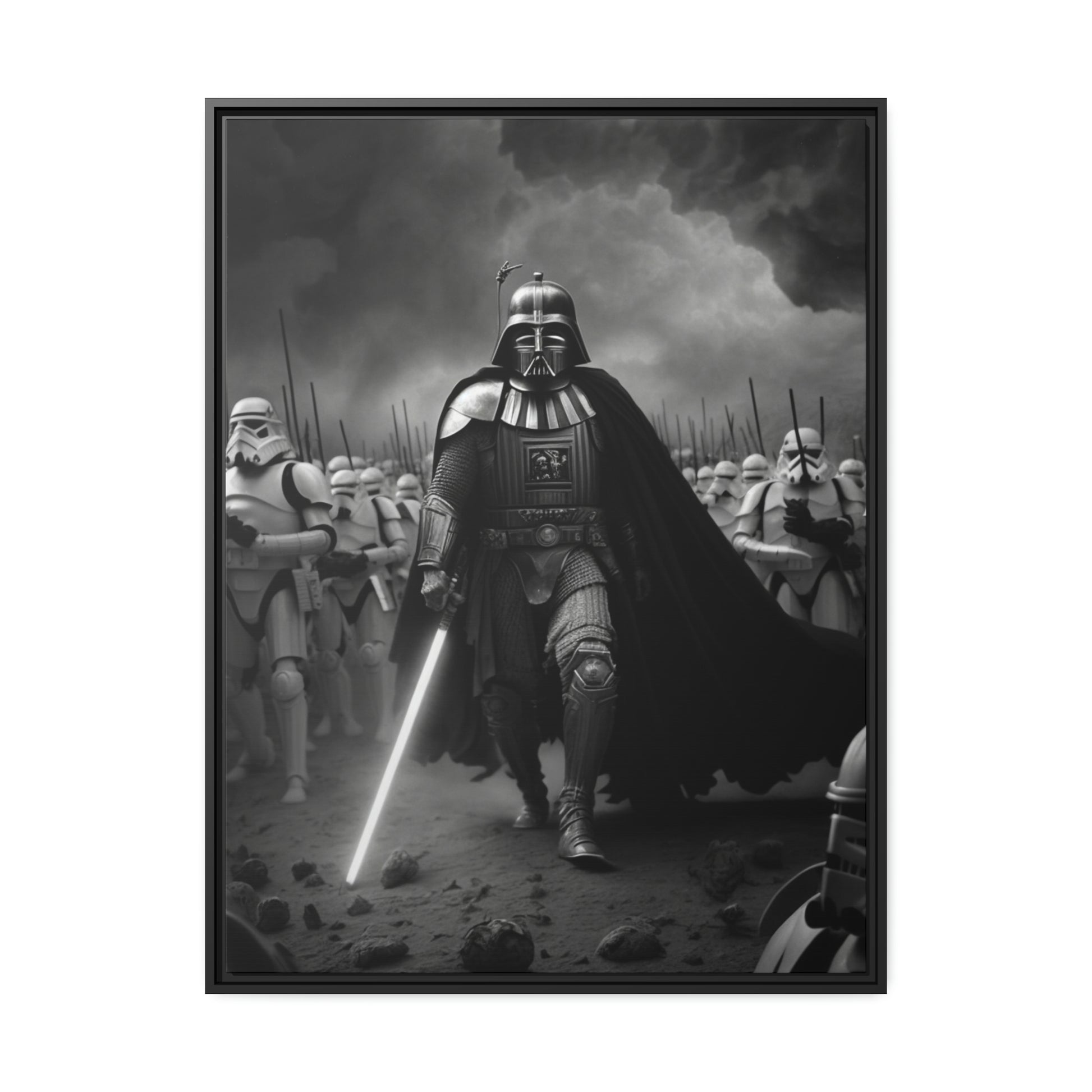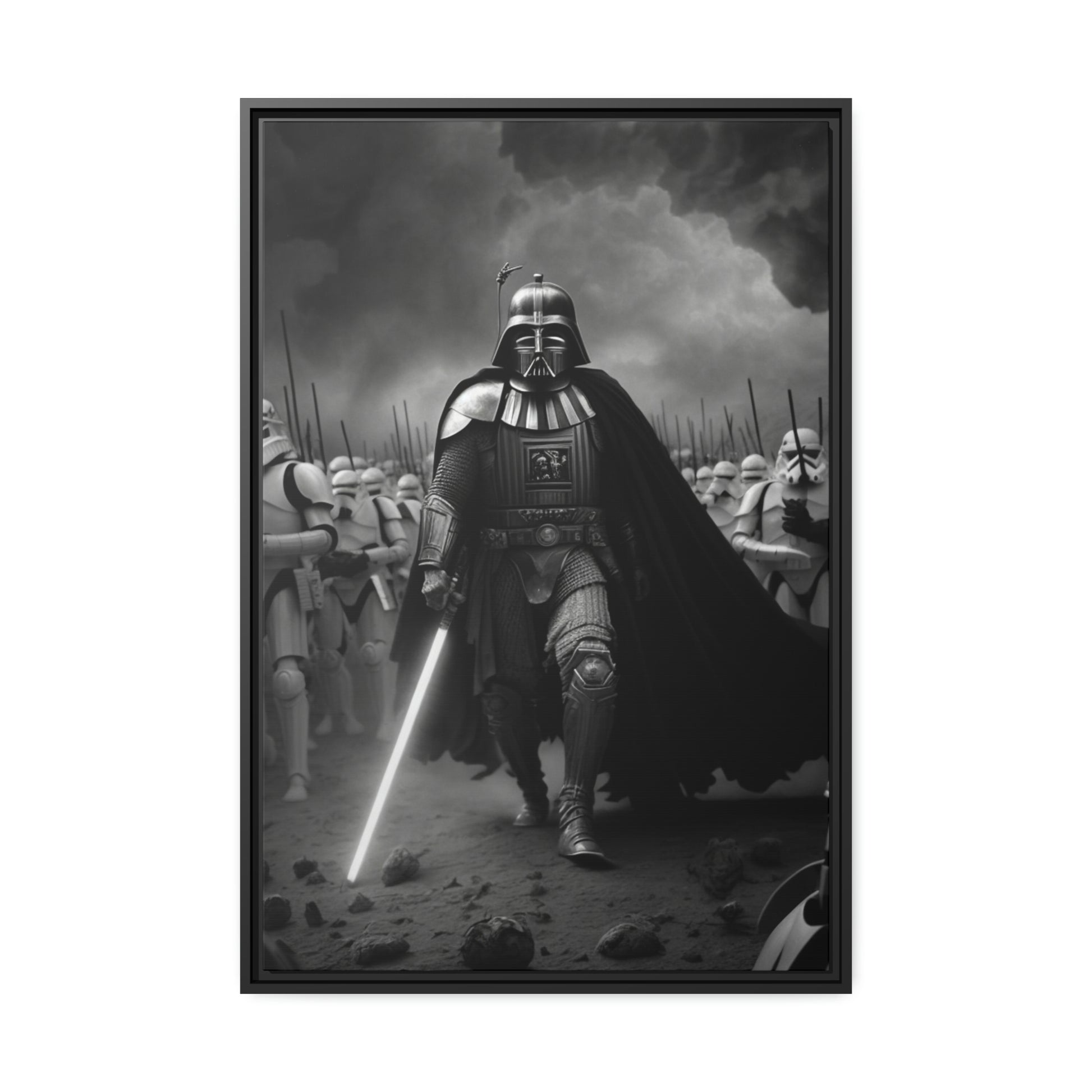 This unique piece captures the drama and intensity of the battle in a visually striking and captivating way, with the added touch of Star Wars imagery. The black and white photo of Lord Vader Leadings his stormtroopers to battle adds a historical touch to the piece, while the vintage style adds warmth and character to your home decor, making it perfect as a statement piece. Whether you're a fan of history or Star Wars