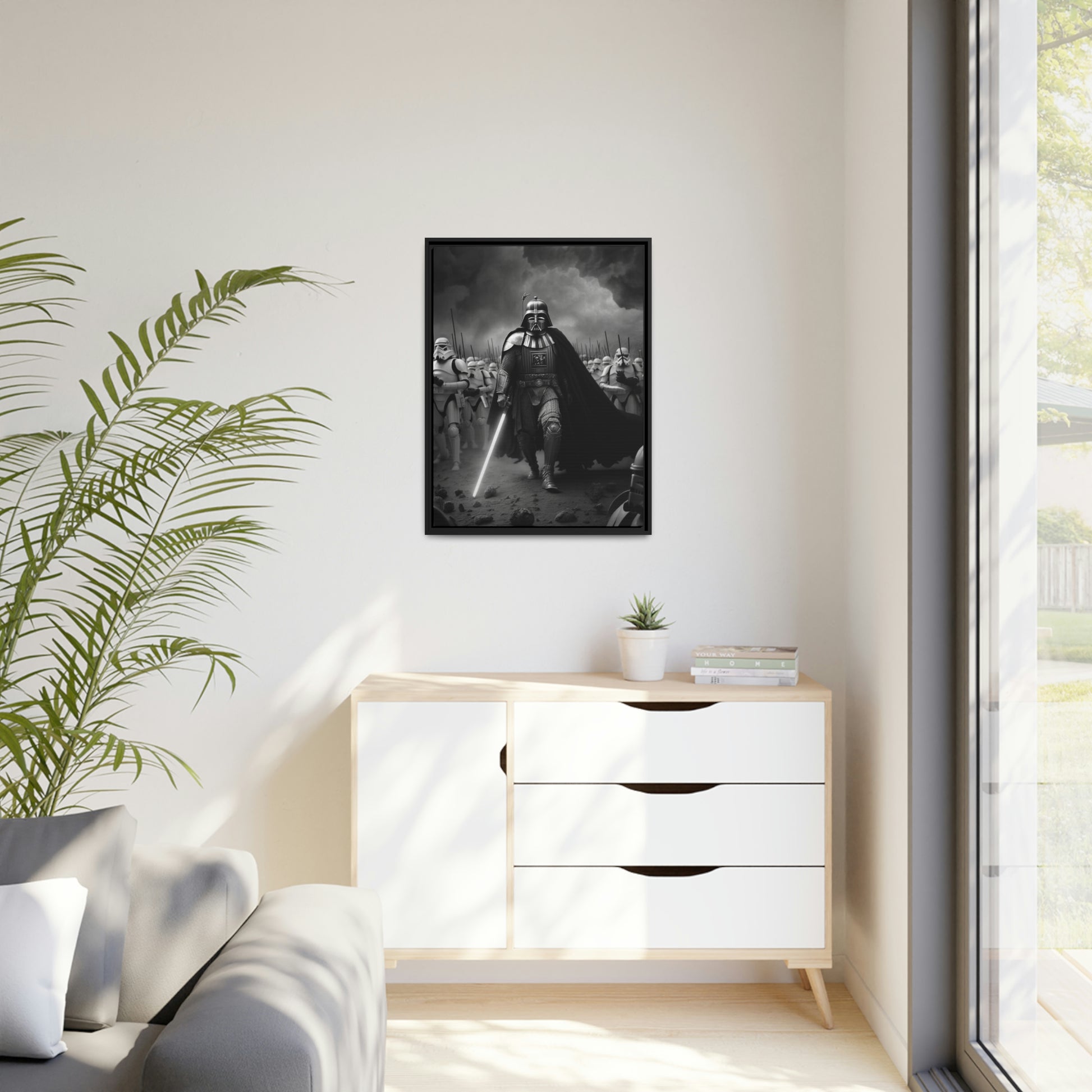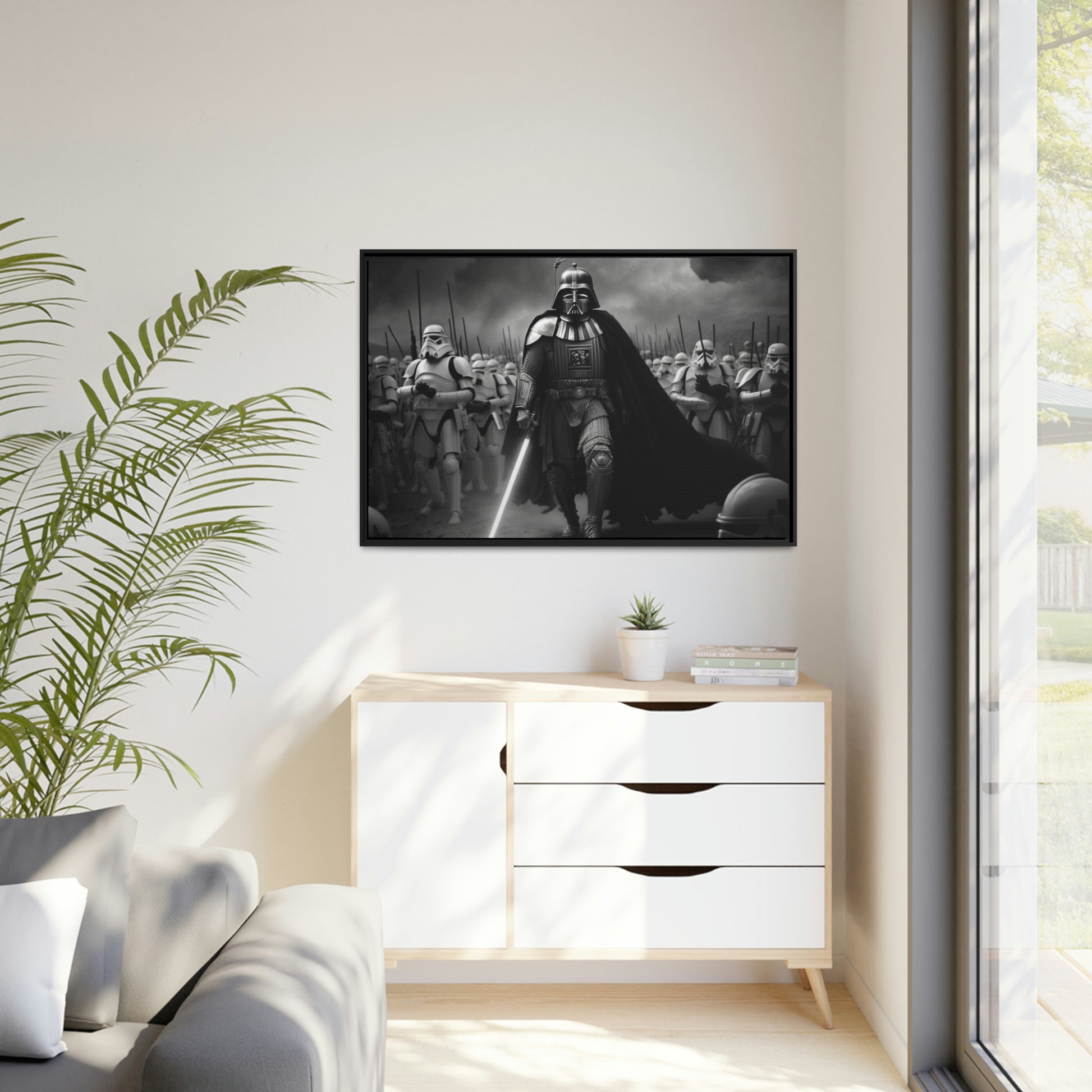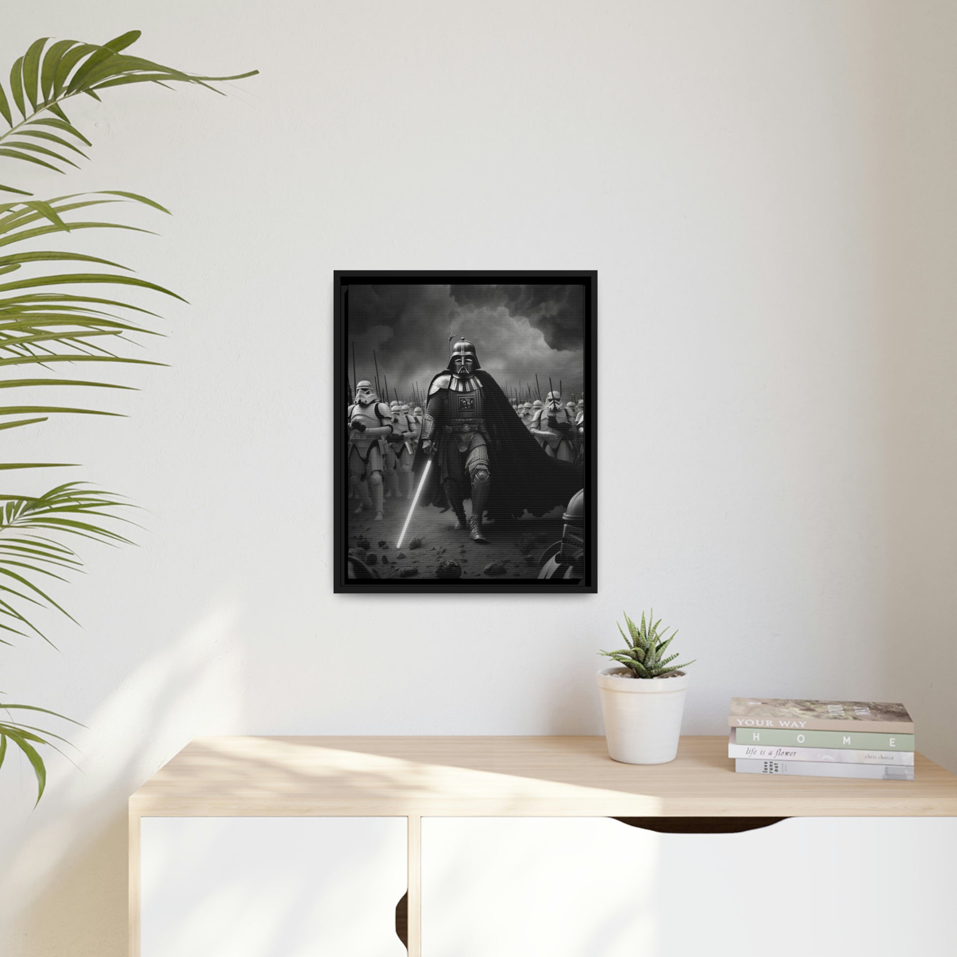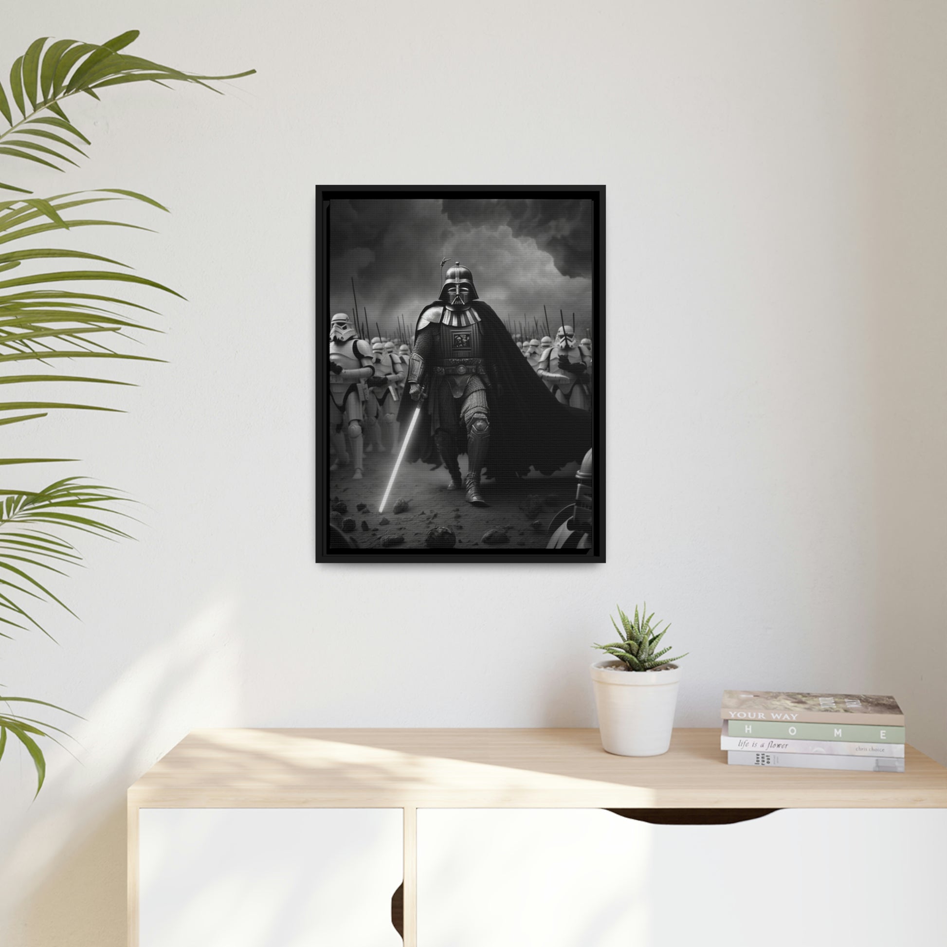 This unique piece captures the drama and intensity of the battle in a visually striking and captivating way, with the added touch of Star Wars imagery. The black and white photo of Lord Vader Leadings his stormtroopers to battle adds a historical touch to the piece, while the vintage style adds warmth and character to your home decor, making it perfect as a statement piece. Whether you're a fan of history or Star Wars