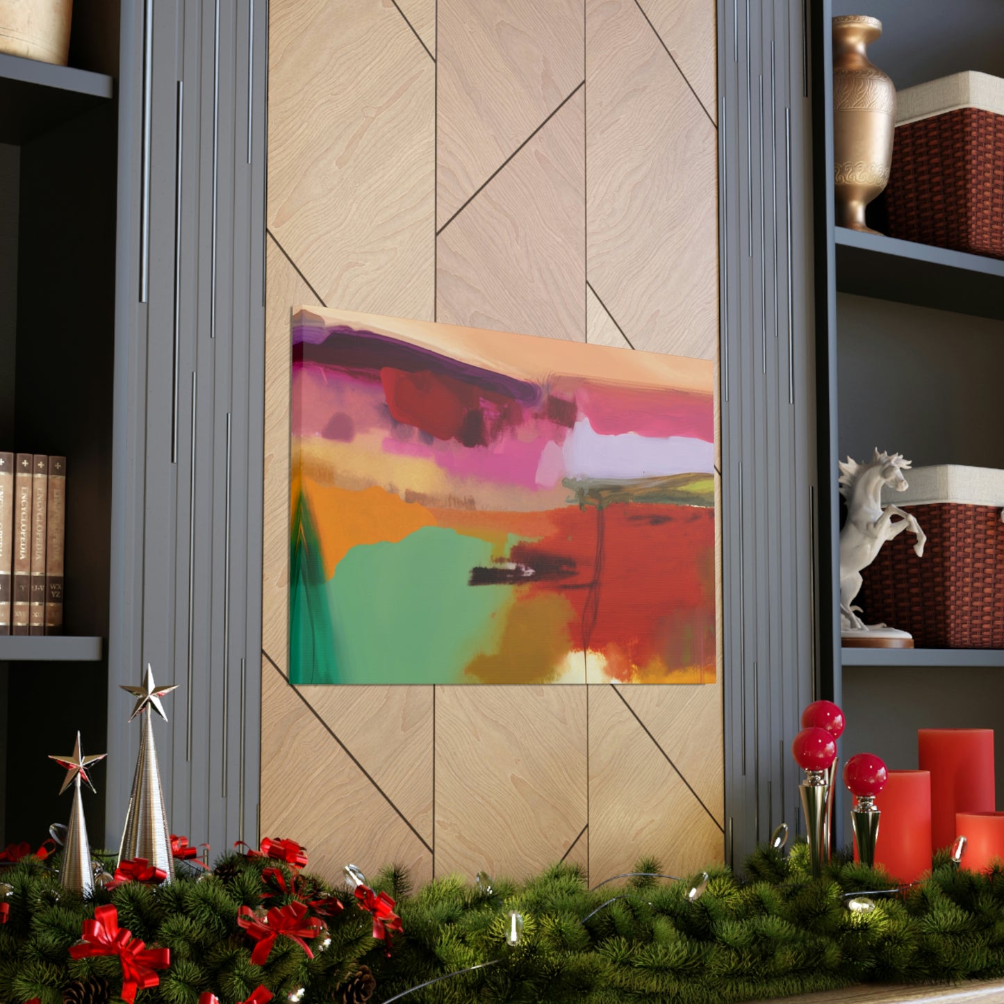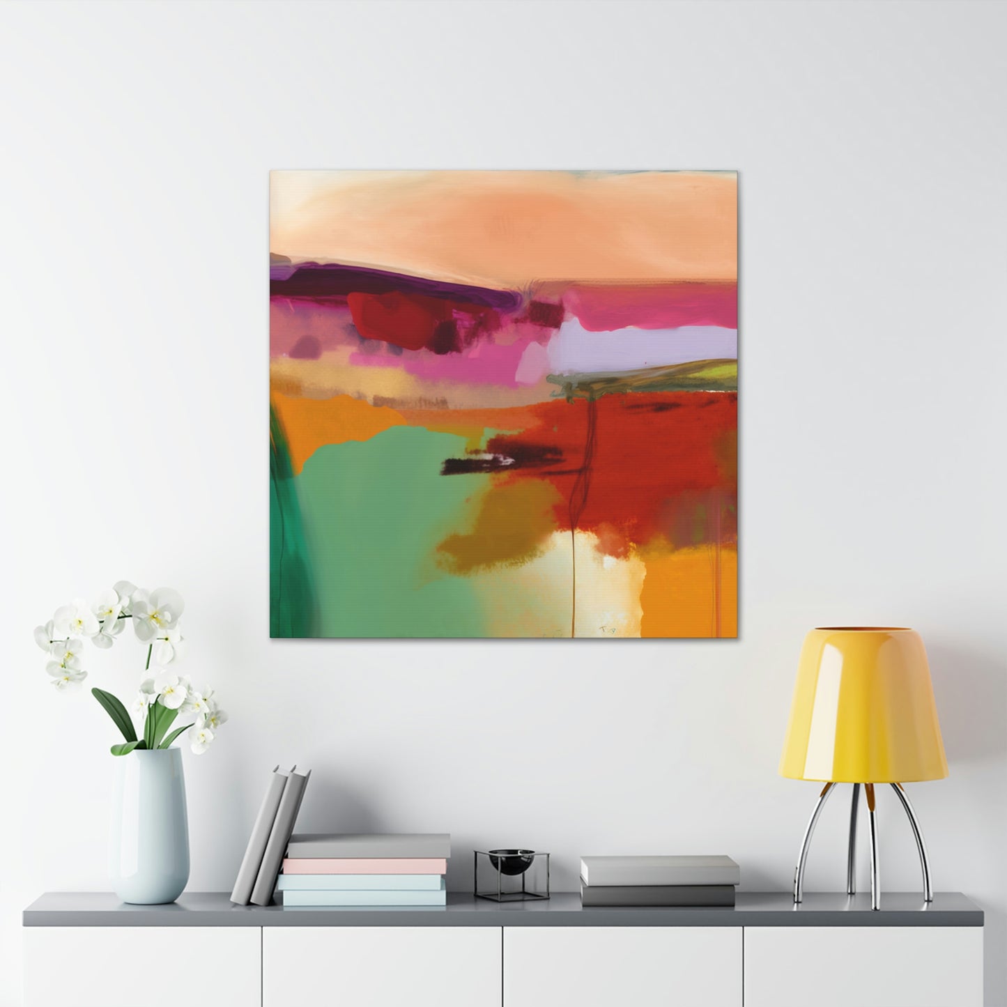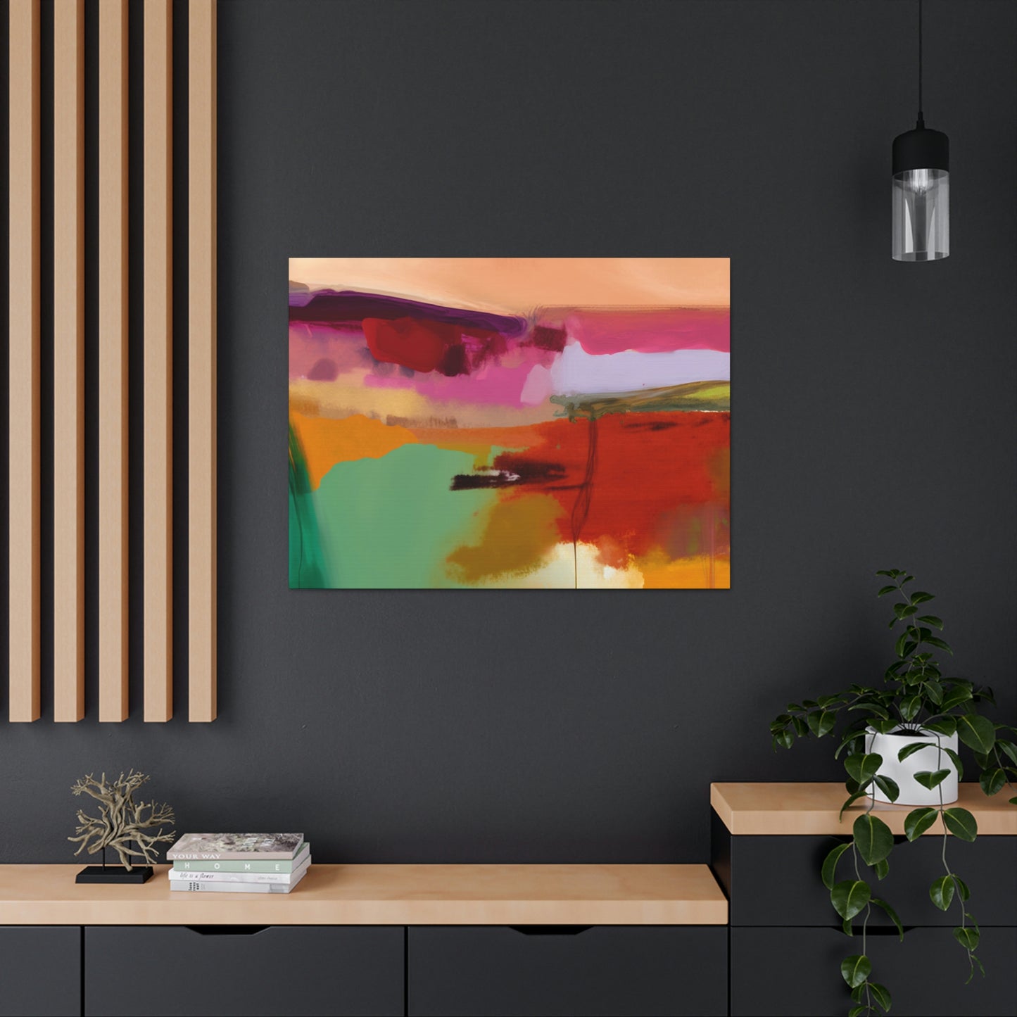 This stunning abstract painting features bold natural colors and organic shapes arranged in a surreal landscape, creating a dreamlike atmosphere. Inspired by the beauty and chaos of nature, this piece transports the viewer to another realm.